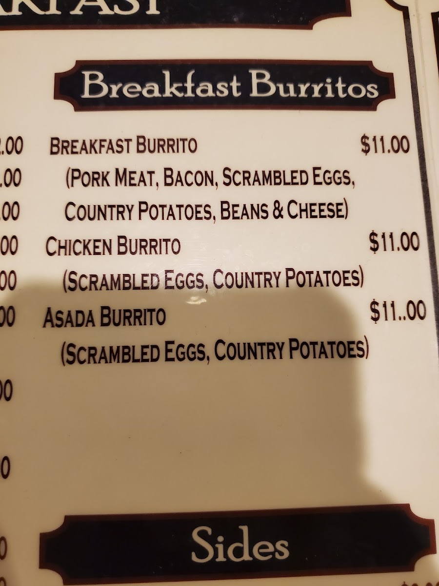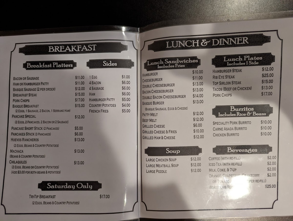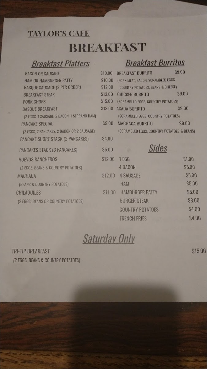 - Specialty Breakfast Items: Features selections such as the Breakfast Burrito Mexicano and a Saturday-only TriTip Breakfast Platter.