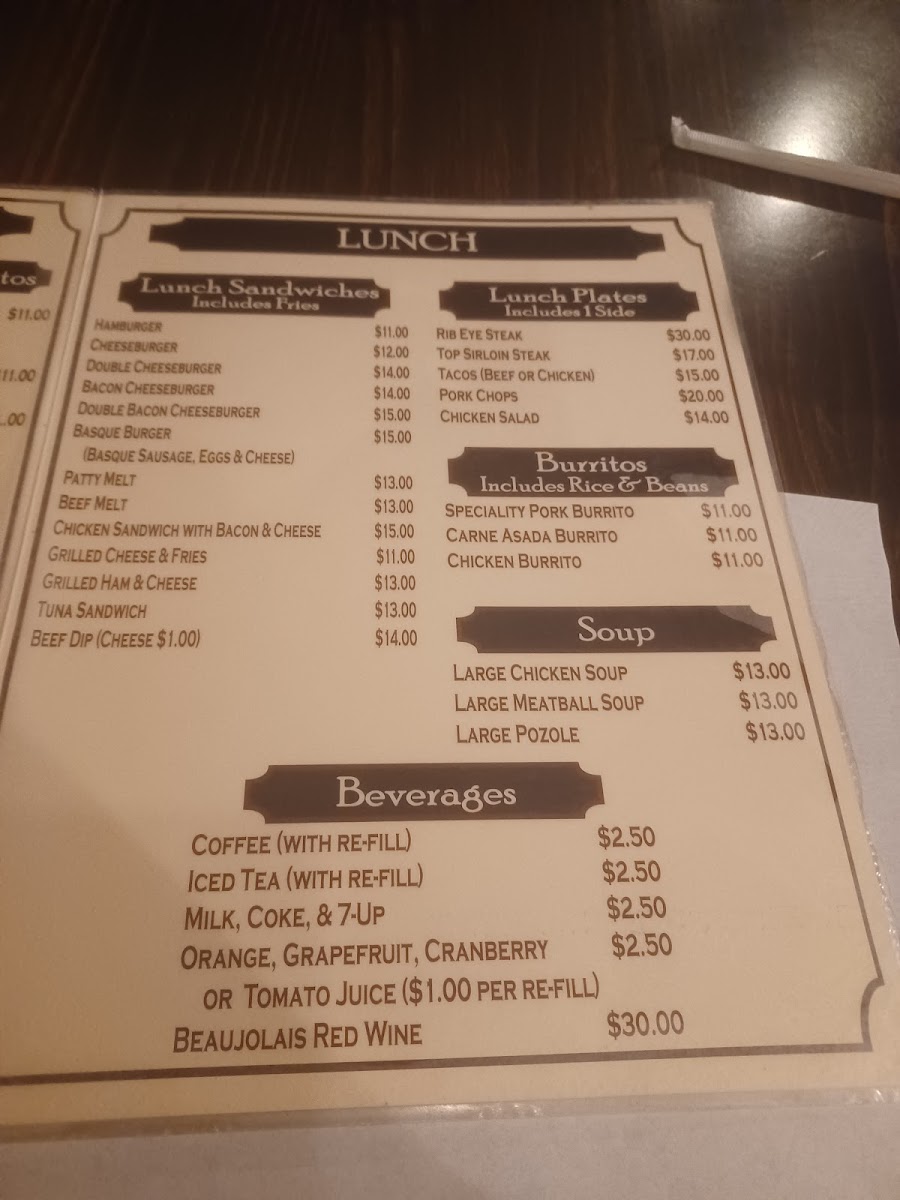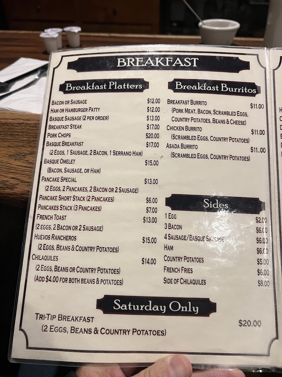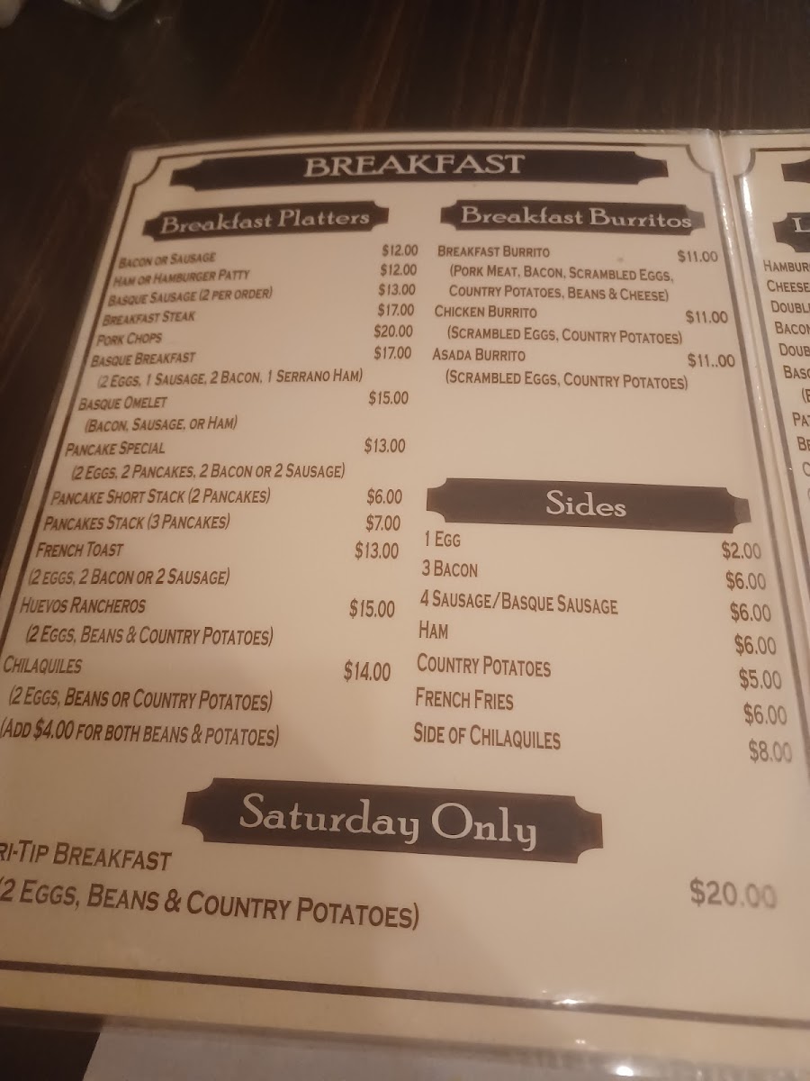- Sides: A range of add-ons including eggs, bacon, sausage (including Basque sausage), ham, country potatoes, French fries, and a side of chilaquiles.